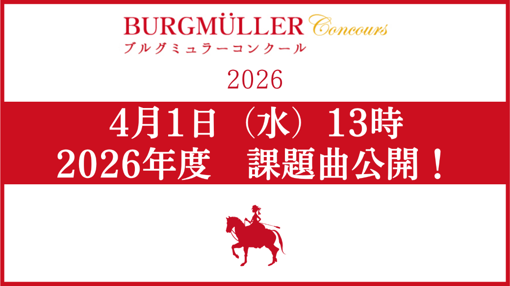 2026年度の課題曲は4月1日(水)午後1時公開予定です! 2026年度のブルグミュラーコンクールの課題曲は4月1日(水)の午後1時に公開予定です。 過去の課題曲はこちらからご確認いただけます。 2026年3月30日月曜日 シェア